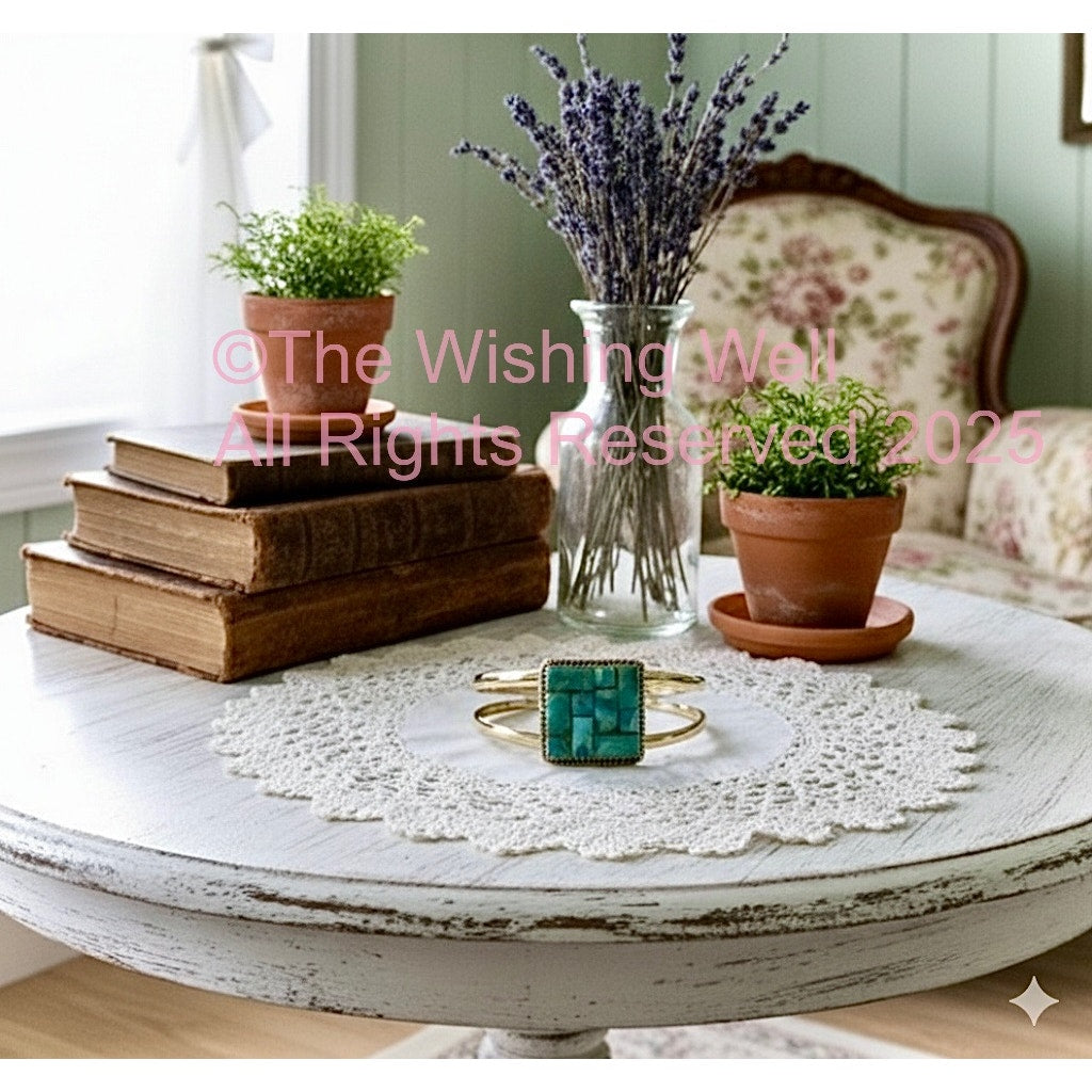 The center piece features a rectangular mosaic of turquoise tiles, each hand-set in a tight grid formation. The stones range from light robin’s egg blue to deep desert sky, with flecks of golden matrix that shimmer like sunlit canyon walls. Framed by a twisted rope border and saw tooth bezel, the inlay evokes sacred geometry—balanced, intentional, and quietly powerful.