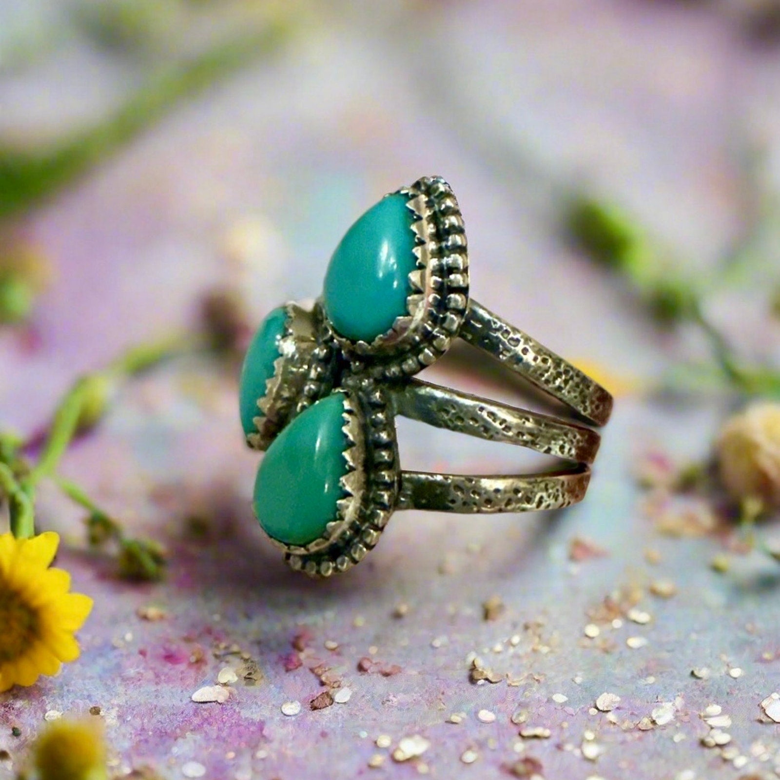 Three Stone Green Turquoise Teardrop/Pear Shape Ring Size 9