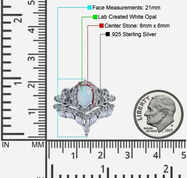 Looking for a stunning wedding band or bridal ring that will make your special day even more memorable? Look no further than this gorgeous vintage-inspired ring featuring a lab created white opal with oval accent stones. This ring is crafted from sterling silver with a .925 stamp and has a dazzling face measurement of 21mm from south to north. The center stone is 8mmx6mm and the ring is available in sizes 5-10. Plus, you'll get a free gift box with your purchase. Don't miss this opportunity to own this beautiful ring at an affordable price. Order yours today and get ready to wow your guests with your elegant style.