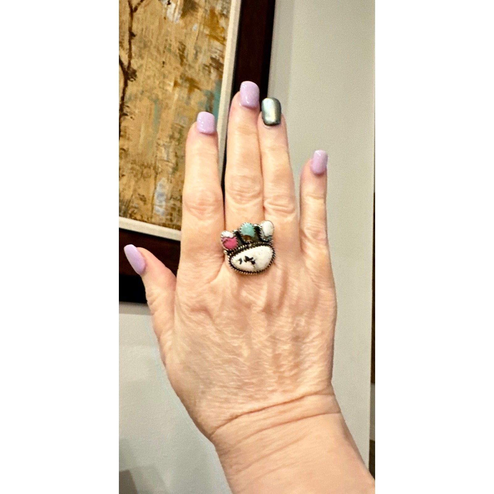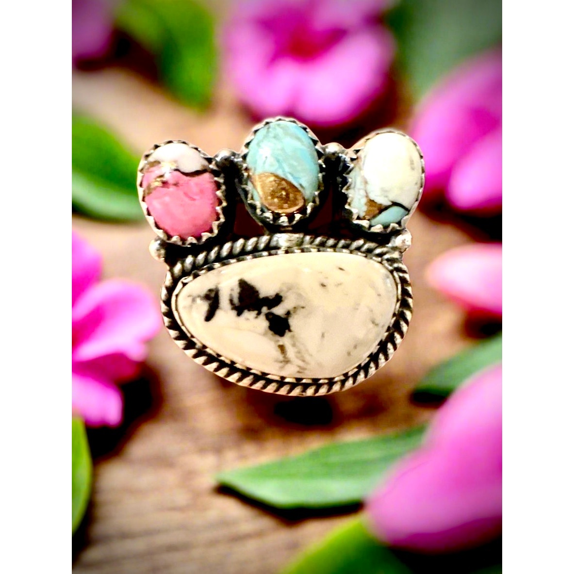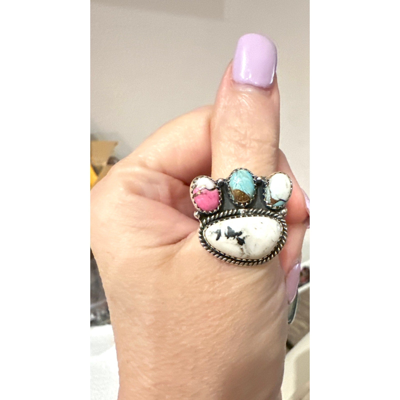 White Buffalo & Cotton Candy Cluster Sterling Ring Adjustable 5-11